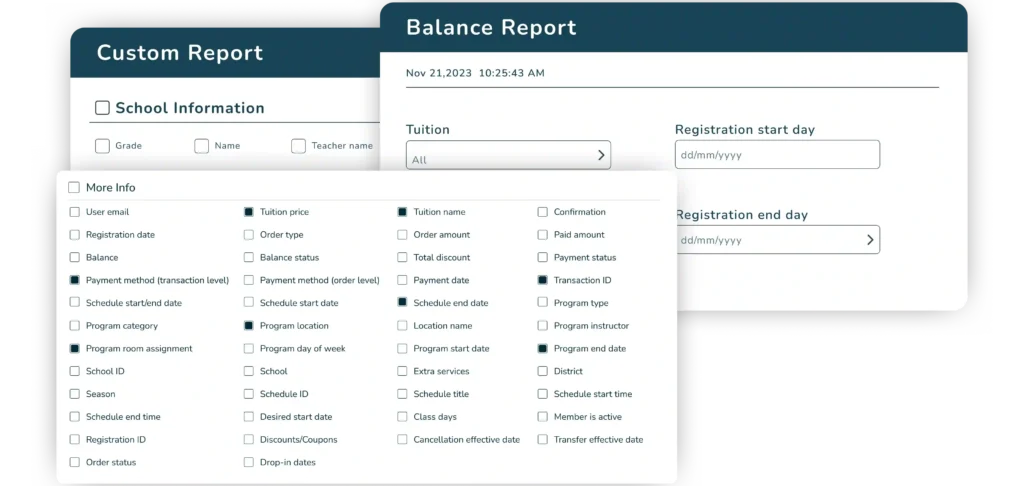- Parent Dashboard: Give families a single source for managing registrations, payments, and schedules in a modern, easy-to-use web-based portal.